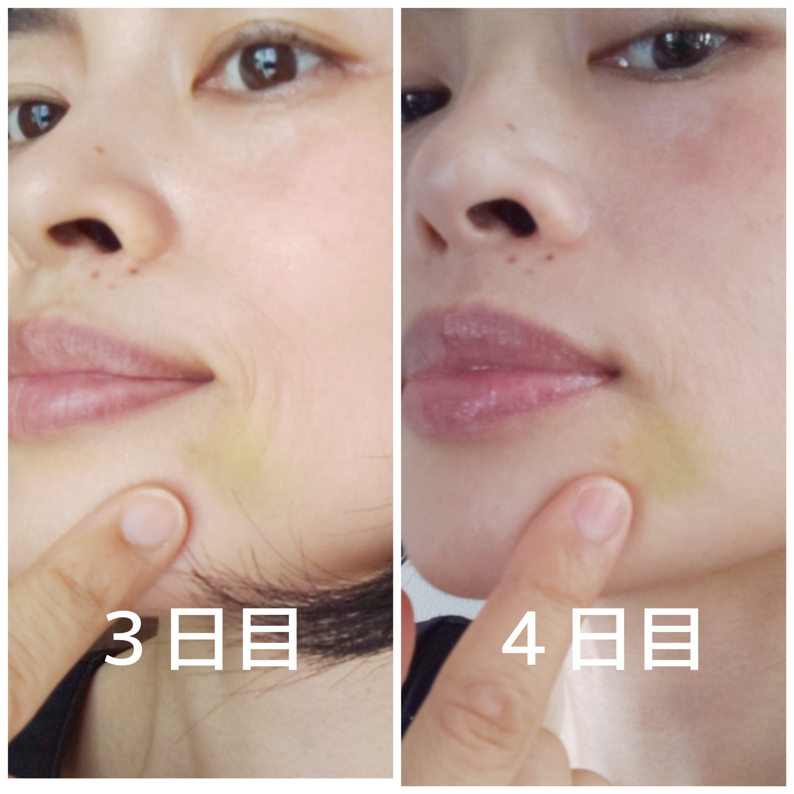 なかなか内出血することがなく画像がなかったため、ずっと保留中でしたが、先日私の口元に内出血が起きたので、写真が撮れました。