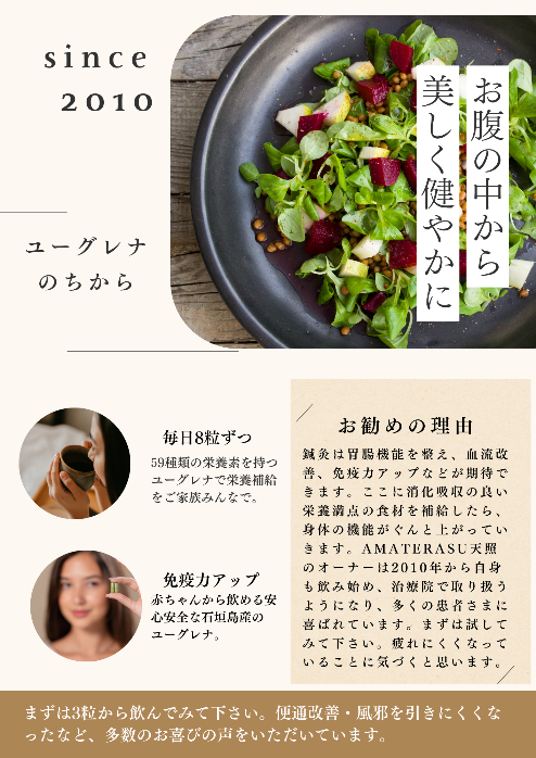 夏は食欲も落ちがちで、どうしても栄養補給に偏りが出ます。そんな時に頼りになるのが、石垣島産のユーグレナ。鍼灸で胃腸の調子を整え、同時に消化吸収しやすい栄養豊富なユーグレナを摂ることで健康の底上げが出来ます。